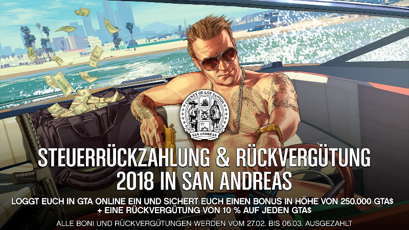 Langsam werden die Steuererklärungen fällig und angesichts des Bevölkerungswachstums im Jahr 2017 freut sich das Finanzministerium von San Andreas, allen Bürgern – Gaunern, Gangstern, Mackern und Bossen gleichermaßen – einen neuen Anreiz bieten zu können.