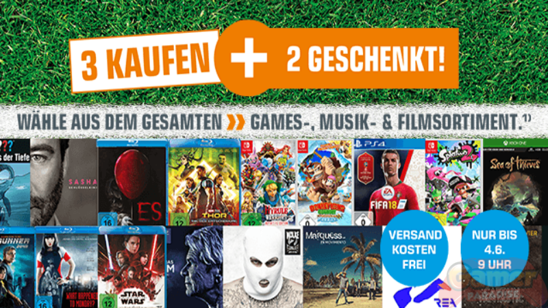 Bei Kauf von fünf Titeln aus allen CDs, Vinyls, DVDs, Blu-rays und Games erhalten Sie einen Nachlass in Höhe der zwei günstigsten Artikel. Ausgenommen Artikel mit Erscheinungsdatum ab dem 1.6.2018 sowie sämtliche Downloads, Downloadcards und Guthabenkarten (z.B. iTunes, Steam, PSN, Xboxlive, etc.). Rückgabe im Markt nur, wenn alle fünf Titel zusammen zurückgegeben werden.