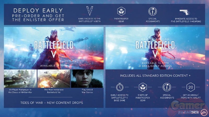 EA bietet Spielern zwei Möglichkeiten, bei Battlefield V – dem völlig neuen Ansatz zum Zweiten Weltkrieg von DICE – dabei zu sein: eine Standard und eine Deluxe Edition. Über das Enlister-Angebot erhalten Spieler, die Battlefield V oder die Battlefield V Deluxe Edition vorbestellen, Vorabzugang zur offenen Beta von Battlefield V und zusätzliche Ingame-Vorteile beim Start. Alle Einzelheiten findest du hier.