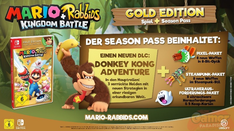 Ubisoft veröffentlicht heute ein neues Video zu Mario + Rabbids Kingdom Battle Donkey Kong Adventure. Donkey Kong wird mit dem bevorstehenden DLC erscheinen und dabei eine originelle Handlung in einer brandneuen Welt mit sich bringen. Der DLC erweitert das Spiel um stundenlanges Gameplay, zahlreiche Kämpfe, einzigartige Herausforderungen und weitere taktischen Abenteuer im Universum von Mario + Rabbids.