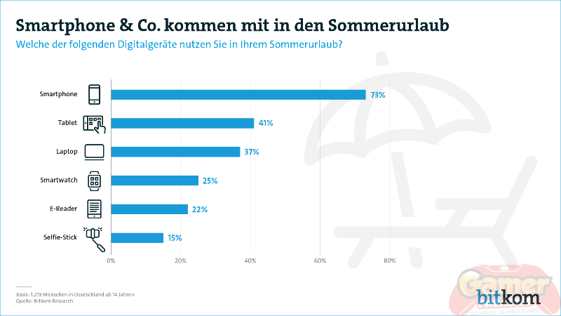 Urlaubsfotos vom Meer, Feriengrüße via Messenger und Videostreaming auf dem Hotelzimmer: Digitalgeräte kommen bei den meisten Bundesbürgern mit in den Urlaub. Allen voran das Allround-Talent Smartphone, auf das sieben von zehn Befragten (73 Prozent) im Sommerurlaub nicht verzichten möchten. Bei den 14- bis 29-Jährigen sind es sogar 91 Prozent. Das zeigt eine repräsentative Befragung im Auftrag des Digitalverbands Bitkom.