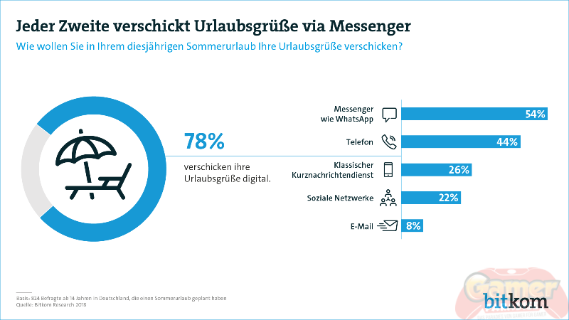 Messenger am Meer, Anruf von der Alm oder Tweet vom Promenadendeck: Ihre Grüße verschickt die große Mehrheit der Urlauber digital. Acht von zehn Reisende (78 Prozent) grüßen die Daheimgebliebenen über Kurznachrichtendienste, Social Media, Email oder klassisch über das Telefon. Das ist das Ergebnis einer repräsentativen Umfrage im Auftrag des Digitalverbands Bitkom. Besonders beliebt sind Messenger wie WhatsApp oder Threema: Mehr als jeder Zweite (54 Prozent) verschickt darüber seine Urlaubsgrüße.