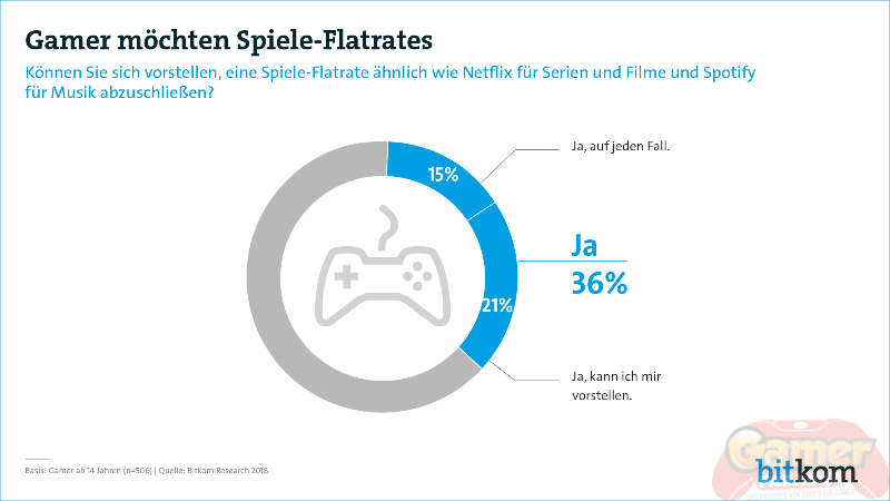 Mehr als ein Drittel der Gamer (36 Prozent) würde eine Gaming-Flatrate nutzen, die ähnlich wie die Abomodelle für Filme, Serien oder Musik funktionieren könnte. Besonders die 14- bis 29-Jährigen hätten daran Interesse (43 Prozent). Börner: „Gaming-Flatrates können die logische Entwicklung aus den aktuellen Trends im Video- und Audiostreaming sein. Klassischerweise werden Spiele im Einzel- oder Onlinehandel oder über Plattformen digital erworben, aber da sich die Spielebranche immer mehr zum Massenmarkt entwickelt, bietet sich eine Abonnentenstruktur an.“