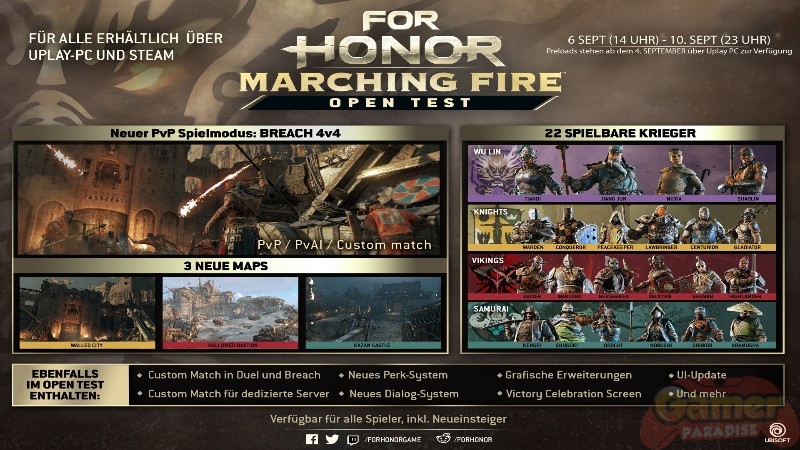 Ubisoft kündigte heute den Open Test für For Honor: Marching Fire an, der vom 6. bis zum 10. September ab 21 Uhr ausschließlich für PC stattfinden wird. Der Test gewährt den Spielern Zugang zu allen 22 Helden, einschließlich der vier neuen Wu Lin-Helden und den brandneuen Verbesserungen. Die Spieler können den Breach- und den Duel-Modus spielen, wobei alle drei Breach-Karten in PvAI, PvP und Custom Match auf den dedizierten Servern verfügbar sind. Alle PC-Spieler können den Open Test ab dem 4. September, 16 Uhr herunterladen.