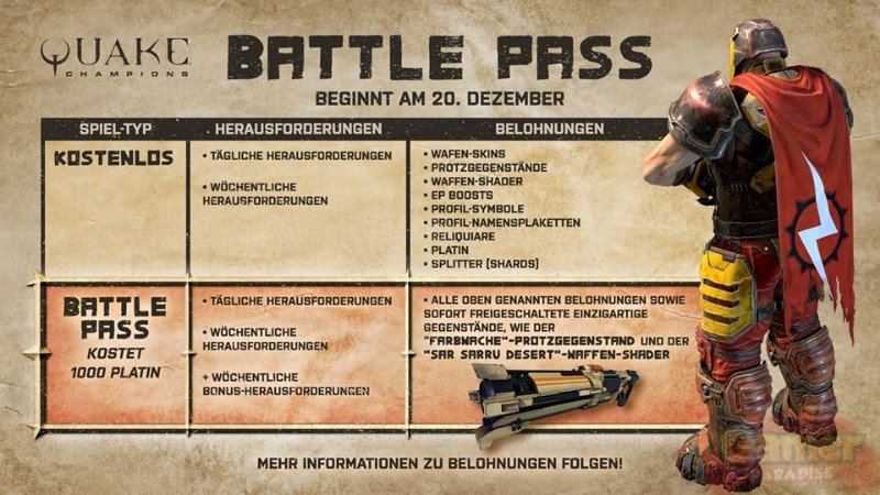 Den Battle Pass in Quake Champions gibt es für 1.000 Platin. Die Einführung des Battle Pass bringt weitere Änderungen an der Ingame-Wirtschaft mit sich, wie etwa das Entfernen von Rucksäcken und Truhen, zusammengelegte Währungen und mehr.