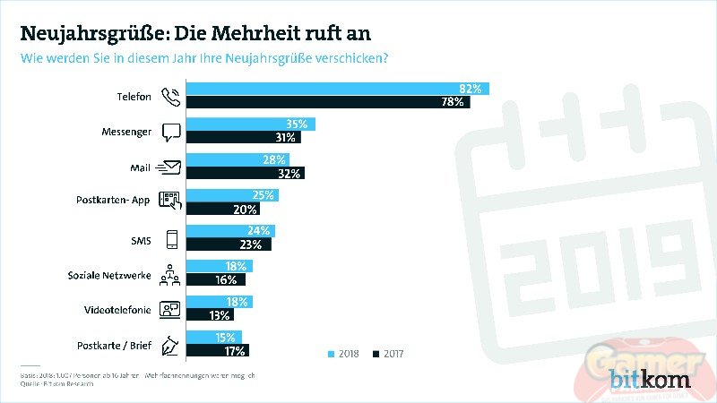 Ob direkt um Mitternacht oder ganz entspannt am Tag nach der großen Sause – die meisten rufen für ihre Neujahrsgrüße an. Das ist das Ergebnis einer repräsentativen Umfrage im Auftrag des Digitalverbands Bitkom unter 1.007 Befragten ab 16 Jahren. Demnach wünschen acht von zehn Deutschen (82 Prozent, 2017: 78 Prozent) telefonisch ein frohes Neujahr. Mehr als jeder Dritte (35 Prozent, 2017: 31 Prozent) verschickt zu diesem Zweck Nachrichten via Messenger wie WhatsApp, Telegram oder iMessage. Unter den Jungen von 16 bis 29 Jahre ist es jeder Zweite (51 Prozent). E-Mails verschicken drei von zehn Befragten (28 Prozent, 2018: 32 Prozent). Bereits jeder Vierte (25 Prozent) und damit 5 Prozentpunkte mehr als noch im Vorjahr (2017: 20 Prozent) nutzen Postkarten-Apps, um ihre Neujahrsgrüße zu versenden. Ähnlich viele Befragte (24 Prozent, 2017: 23 Prozent) nutzen klassische Kurznachrichten-Dienste, wie SMS, um ihre Grüße zu verschicken. Gut jeder sechste Bundesbürger (18 Prozent, 2017: 16 Prozent) postet seine Grüße in einem sozialen Netzwerk, ebenso viele (18 Prozent, 2017: 13 Prozent) nutzen Videotelefonie.