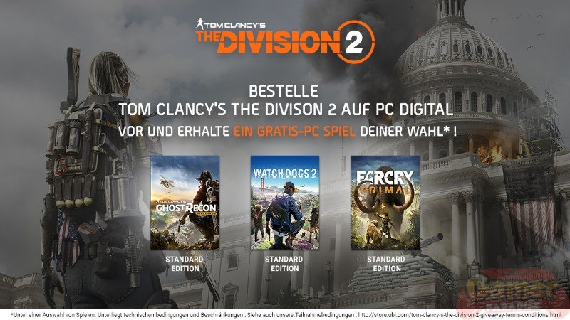Ubisoft kündigte an, dass Spieler, die vor dem 14. März 2019 eine digitale PC-Version von Tom Clancy’s The Division 2 vorbestellen, eine kostenloses digitale PC-Version ihrer Wahl aus einer Auswahl beliebter Titel aus dem Portfolio von Ubisoft erhalten. Zur Auswahl stehen: Watch Dogs 2, Tom Clancy’s Ghost Recon Wildlands und Far Cry Primal. Spieler können die PC-Version von Tom Clancy’s The Division 2 auf www.epicgames.com/store oder im Ubisoft Store unter https://store.ubi.com vorbestellen.