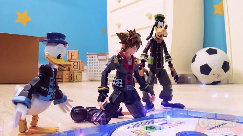 Im Video erwachen die exklusiven BRING ARTS-Figuren von Sora, Donald und Goofy zum Leben und bekämpfen eine Horde Herzloser, die in Andys Zimmer einmarschiert.