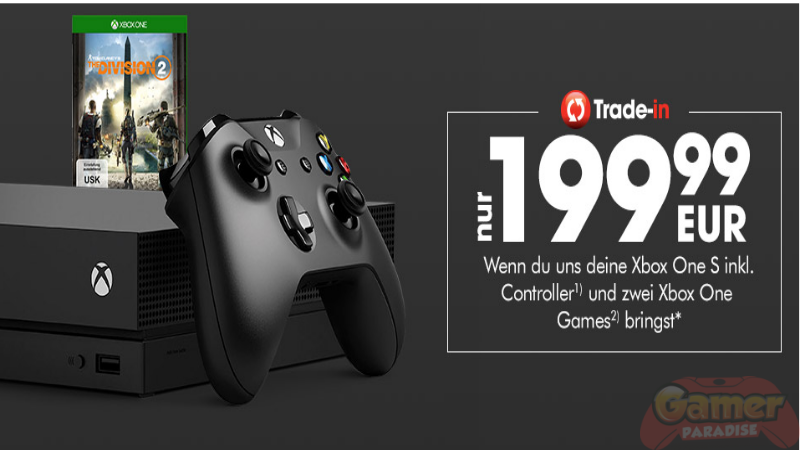 Ab sofort bis zum 3. Juni tauschst Du im Rahmen einer Trade-In-Aktion von GameStop Deine gebrauchte Xbox One, Xbox One S (inklusive Zubehör) sowie andere Konsolen gegen ein vergünstigtes Xbox One X-Bundle (zum Beispiel mit The Division 2) ein. Profitiere von der Aktion und erhalte ein Xbox One X-Bundle im Tausch gegen eine Xbox One S für 199,99 Euro statt 499,99 Euro. Einen Überblick zu allen Angeboten findest Du hier: