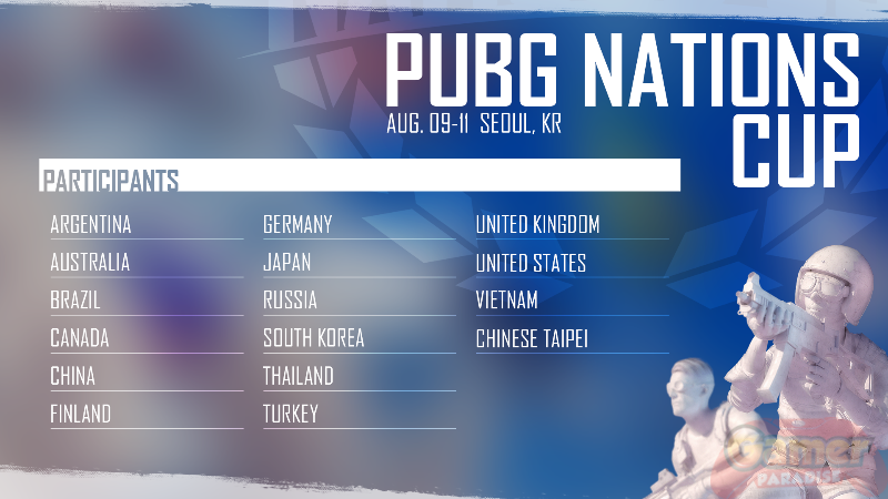 Die PUBG Corporation präsentiert den PUBG Nations Cup, eine internationale PUBG Esport-Veranstaltung, die von 9. bis 11. August in Seoul, Südkorea, in der Jangchung Arena stattfindet. Beim PUBG Nations Cup treten die besten PUBG-Profispieler gemeinsam, wie eine Nationalmannschaft, für ihr Land an. Angefeuert von Fans auf der ganzen Welt spielen die PUBG-Profis um einen Preispool von 500.000 US-Dollar sowie die Trophäe des PUBG Nations Cup.