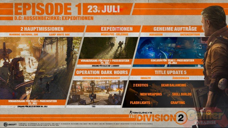 Als Teil des kostenlosen Inhalts von Year 1, wird Episode 1 – Washingtons Vorstädte: Expeditionen den Kampf außerhalb der Straßen von Washington D.C. verlagern. Der frische Inhalt von Episode 1 bringt neue Orte zum Erkunden und setzt dort an, wo die Geschichte nach dem Endboss von Tidal Basin endete. Episode 1 wird samt Expeditionen am 23. Juli für alle Inhaber eines Year 1-Passes und am 30. Juli für alle anderen Spieler erscheinen.