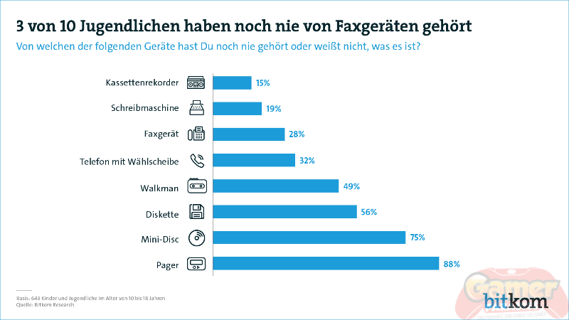 Ein Drittel der 10- bis 18-Jährigen (32 Prozent) kennt kein Telefon mit Wählscheibe, zwei von fünf (38 Prozent) haben noch nie von Filmen für Fotoapparate gehört. Die Hälfte von ihnen (50 Prozent) weiß etwas mit einem Walkman anzufangen. Und die Diskette ist bei mehr als jedem Zweiten (56 Prozent) zwischen 10 und 18 Jahren unbekannt. Bei den 10- bis 11-Jährigen kann sich sogar nur noch ein Fünftel (22 Prozent) etwas unter einer Diskette vorstellen. Fast vergessen sind in der jungen Generation Geräte wie die Mini-Disc oder der Pager. Nur ein Viertel (24 Prozent) bzw. jeder neunte (11 Prozent) der Jugendlichen kennt sie noch.