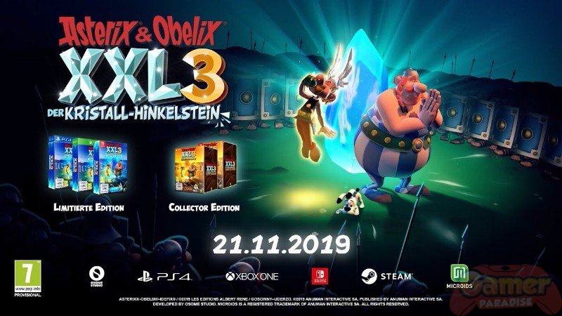 Asterix & Obelix XXL3: Der Kristall-Hinkelstein wird ab dem 21. November 2019 für Nintendo Switch, PlayStation 4, Xbox One und PC erhältlich sein. Das Spiel erscheint sowohl in einer digitalen als auch mit der Limited Edition und der Collector‘s Edition in zwei physischen Versionen und mit deutscher Text- und Sprachausgabe.
