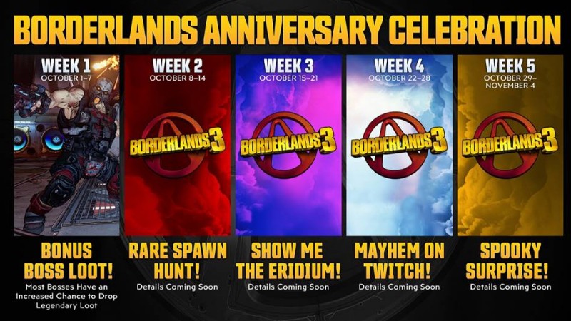 Zeig mir das Eridium“ läuft vom 15. bis zum 22. Oktober, dann startet das Event der kommenden Woche. Unterhalb findest du den Terminkalender zur übrigen Borderlands-Jubiläumsfeier.