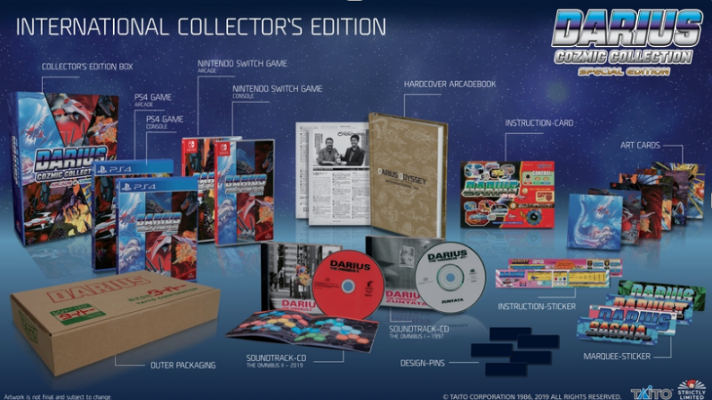 Die Darius Cozmic Collection Console begeistert die Fans mit 6 legendären Konsolentiteln in insgesamt 9 Versionen sowie einem exklusiven Sagaia- Emaille-Pin-Abzeichen zum Preis von 54,99 EUR. Limitiert auf 1.900 Einheiten (PS4) bzw. 2.500 Einheiten (NSW).