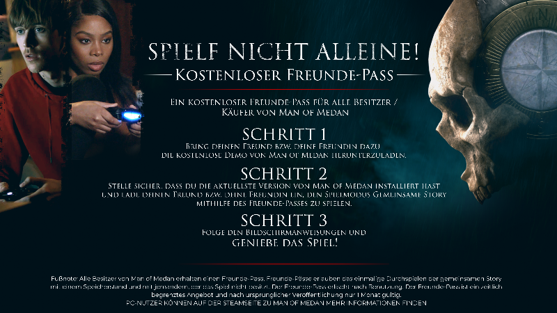 Das Angebot gilt für PlayStation 4, Xbox One und PC digital und setzt die Nutzung der gleichen Plattform voraus. Um als Freund das Spiel spielen zu können, muss zunächst die Testversion von Man of Medan heruntergeladen werden. Der Friend’s Pass wird als Patch bereitgestellt.