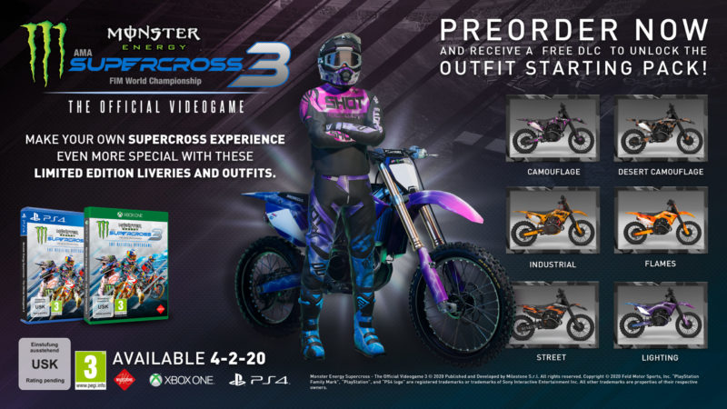 Monster Energy Supercross – The Official Videogame 3 wird weltweit ab dem 4. Februar 2020 auf allen Plattformen PlayStation4, Xbox One, Windows PC/STEAM, Google Stadia und Nintendo Switch verfügbar sein.