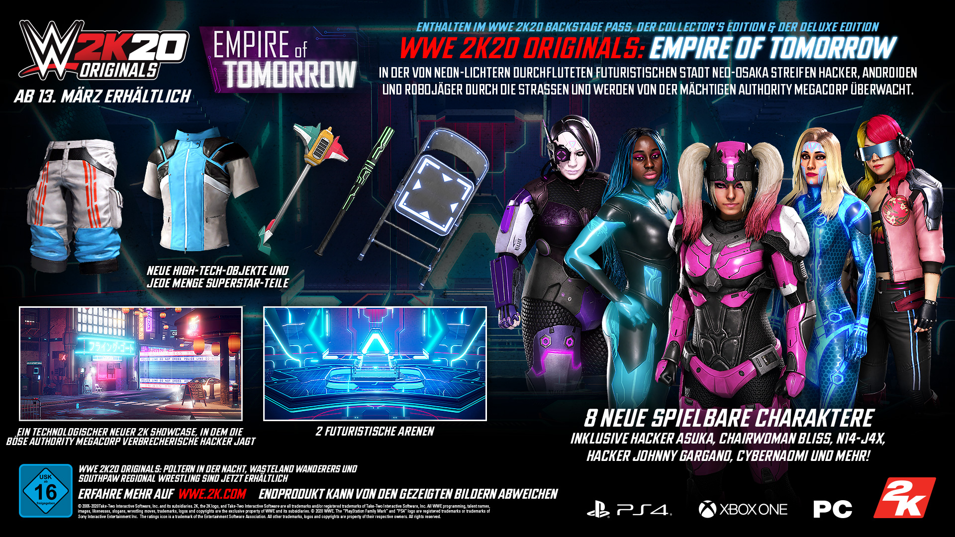 In der von Neonlicht durchfluteten Zukunftsstadt Neo-Osaka streifen Hacker, Androiden und Roboterjäger durch die Straßen, all dies unter dem wachsamen Auge der allmächtigen Behörde Megacorp. Willkommen bei Empire of Tomorrow, dem vierten und finalen DLC-Paket von WWE 2K20 Originals, erhältlich als Teil des WWE 2K20-Backstagepasses und in jeder Version der WWE 2K20 Deluxe und SmackDown! 20th Anniversary Editionen enthalten.