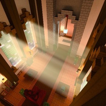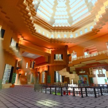 - Imagination Island RTX von BlockWorks – Ein vollständig erkundbarer Vergnügungspark mit vielen Easter Eggs. Diese Karte beherbergt vier verschiedene Länder, von denen jedes einem speziellen Aspekt von Echtzeit-Raytracing gewidmet ist. Auf den Bildern sieht man das Besucherzentrum des Parks, das durch so genannte “God-Rays” beleuchtet wird, die in Echtzeit durch die Fenster auf den Boden scheinen.