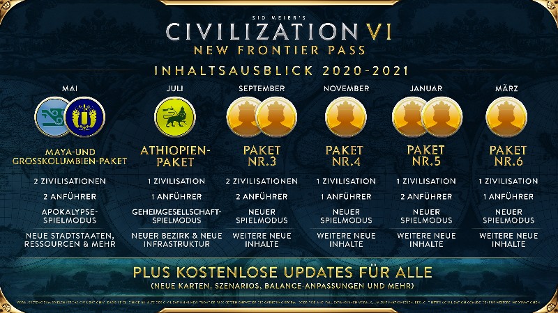 Im Rahmen des Inhaltsausblicks für Civilization VI wird Firaxis zwischen den DLC-Paketen zusätzliche kostenlose Updates mit neuen Karten, Szenarios, Balance-Anpassungen und mehr für alle Besitzer des Spiels veröffentlichen.
