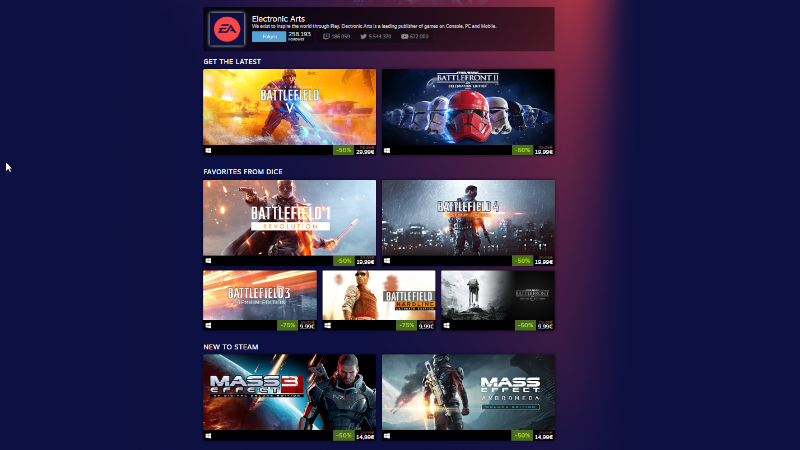 Ab heute können Spieler moderne Kriegsführung in Battlefield 3 und Battlefield 4, sowie historische Schlachten des ersten und zweiten Weltkriegs in Battlefield 1 und Battlefield V auch auf Steam erleben. Außerdem können in Mass Effect 3 und Mass Effect: Andromeda fremde Welten besucht werden, und Spieler schlüpfen in die Rollen ikonischer Star Wars-Charaktere in Star Wars Battlefront I und Star Wars Battlefront II.