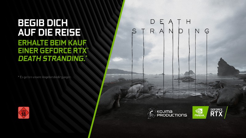 NVIDIA, 505 Games und KOJIMA PRODUCTIONS präsentieren das Paket „DEATH STRANDING Embark On Your Journey“. Damit erhalten Spieler für eine begrenzte Zeit einen Steam-Code für die PC Digital Download-Edition von DEATH STRANDING beim Kauf einer geeigneten GeForce RTX 2080 Ti, 2080 SUPER, 2080, 2070 SUPER, 2080, 2070, 2060 SUPER oder 2060 GPU-integrierten Grafikkarte, eines Laptops oder Desktops. Das Bundle „DEATH STRANDING Embark On Your Journey“ startet ab sofort und ist bis zum 29. Juli 2020 erhältlich.