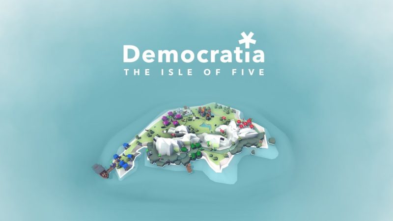 Democratia – The Isle of Five versetzt den Spieler auf eine Insel, die verdächtige Ähnlichkeit mit der Schweiz besitzt und von fünf Clans beherrscht wird. Als Anführer eines der Clans gilt es, die eigene politische Agenda in der direkten Demokratie durchzusetzen. Ob man nun versucht, als Öko-Unterstützerin den Veganismus obligatorisch zu machen, oder als konservativer Bergler eine Mauer um die Insel ziehen möchte, alles ist per Volksabstimmung möglich. Zwischen den Abstimmungen kommt es zu zufälligen Events wie Naturkatastrophen oder UFO-Landungen, die die eigene politisch Expertise auf die Probe stellen. Trotzdem müssen alle an einem Strang ziehen – denn wenn ein Clan zu Grunde geht, ist die gesamte Insel dem Untergang geweiht.