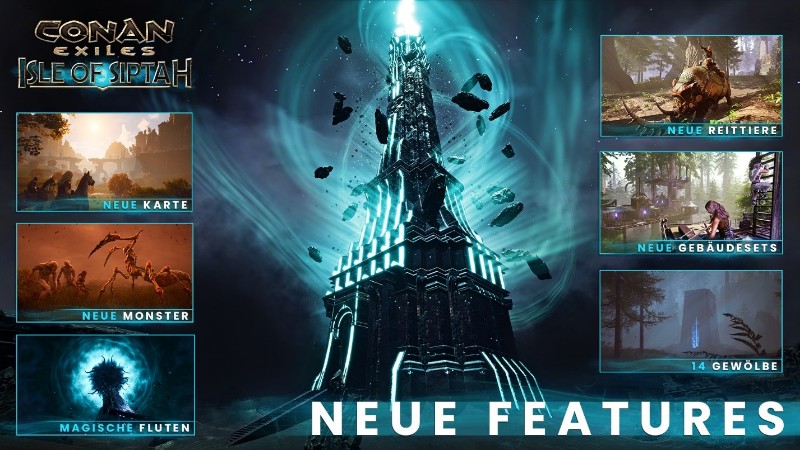 Conan Exiles: Isle of Siptah gewährt neuen und alten Spielern gleichermaßen die Chance auf einen Neuanfang. Jeder beginnt seine Reise mit einem neuen Charakter. Die Erweiterung erscheint mit zwei neuen Gebäude-Sets, die es erlauben, mit Treibgut Piraten-Städte und mit Sturmglas majestätische Burgen zu errichten. Spieler können sich auf einem neuen Reittier in die Schlacht stürzen, dem mächtigem Nashorn. Wer die Erweiterung bereits im Early Access spielt, erhält zusätzlich einen limitierten Reittier-Skin für das Nashorn. Die neuen Bau-Sets und Mounts sind auch in den Gebieten des Hauptspiels nutzbar, solange Isle of Siptah installiert ist.