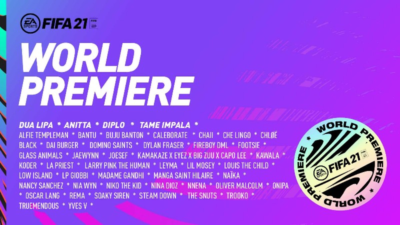 EA SPORTS FIFA 21 feiert seine Weltpremiere am 1. Oktober 2020 mit der ersten FIFA World Celebration. Über 40 Künstler, die auf dem FIFA 21-Soundtrack vertreten sind, feiern auf ihren Kanälen gemeinsam mit den Fans die Premiere und den kommenden Start des Spiels. Während des 22 Stunden dauernden Events können Fußballfans ihren liebsten Künstlern aus der ganzen Welt lauschen und an weiteren Aktivitäten teilnehmen – vollständige Informationen und das Lineup sind hier zu finden.