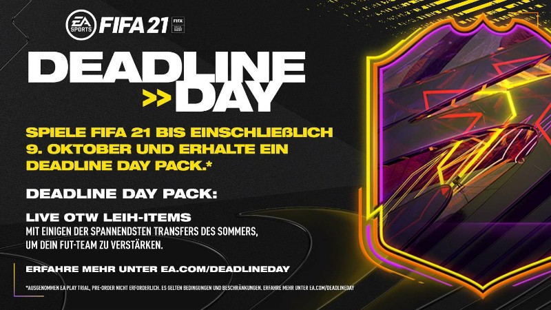 Zum bevorstehenden Release von EA SPORTS FIFA 21 feiert Electronic Arts mit dem neuen Deadline Day-Paket alle Fans, die bis zum 10. Oktober 2020 um 08:59 Uhr deutscher Zeit in die Vollversion auf PlayStation 4, Xbox One oder PC einsteigen. Dieses Paket enthält neben einem untauschbaren „Team of the Week“-Spieler-Item auch die „FIFA Ultimate Team Ones To Watch Leih-Items“ mit einigen der aufregendsten Transfers des Sommers.