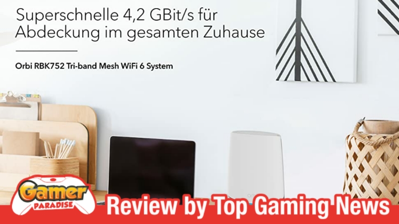 Das Netgear Orbi RBK752 WiFi 6 Mesh-System ist aber vor allem hervorzuheben, da es ein Tri-Band-W-LAN etabliert, um für maximale Geschwindigkeit zu sorgen. Das Netz zwischen den orbi Satelliten und Endgeräten wird sowohl mittels 2,4 GHz als auch über 5 GHz hergestellt. Ein weiteres drittes Netz im 5 GHz Bereich sorgt dann wiederum für die Verbindung zwischen orbi Router und orbi Satellit. Die Geschwindigkeiten können so bis zu 4,2 Gbit/s betragen, was das parallele Streamen von mehreren 8K-UHD-Filmen ermöglicht. Im Test waren wir von der Leistung ziemlich beeindruckt. Vor allem das Streamen und zeitgleiche Zocken ging problemlos, während der 08/15-Router unseres Internetproviders hier bereits versagt.