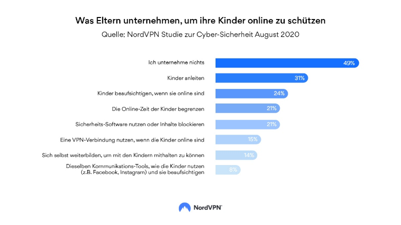 Die neueste Umfrage von NordVPN zeigt, dass 49 Prozent der Eltern in Deutschland (51% der Frauen und 47% der Männer) keine Vorkehrungen zum Schutz ihrer Kinder online treffen. Dem gegenüber stehen die Eltern, die aus Sorge um die digitale Sicherheit, ihren Nachwuchs anleiten (31%), ihre Kinder beaufsichtigen, wenn sie online sind (24%), Sicherheitssoftware nutzen (21%), oder die Internet-Zeit der Kinder begrenzen (21%).