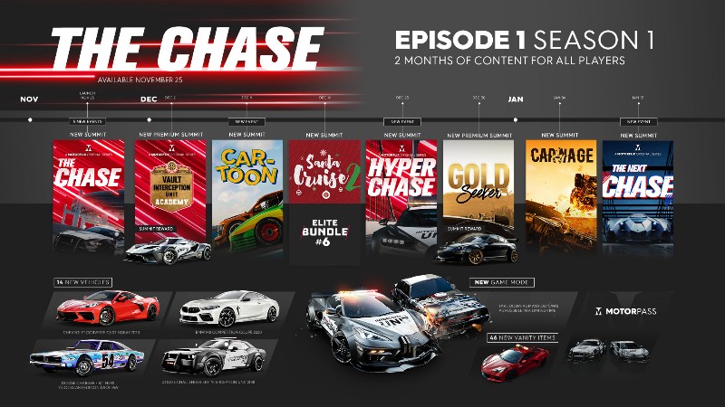Jede Episode dauert vier Monate und besteht aus zwei aufeinanderfolgenden Episoden, die zwei Monate lang andauern. In der allerersten Episode, The Chase, verkörpern die Spieler einen Elite-Fahrer der Interception Unit der Vault Corp, einer Privatbank. Der Auftrag lautet: Die Gesetzlosen müssen aufgehalten werden, bevor sie aus der Stadt fliehen.
