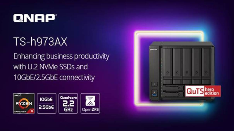 QNAP Systems, Inc., ein führender Innovator von Computer-, Netzwerk- und Speicherlösungen, hat heute das TS-h973AX QuTS hero NAS vorgestellt, das mit einem AMD Ryzen V1000 Serie V1500B Quad-Core 2,2 GHz Prozessor und 10GbE/2,5GbE Konnektivität ausgestattet ist. Es verfügt über vier 2,5-Zoll SSD Steckplätze – wobei zwei Steckplätze sowohl leistungsfähige 32Gbps U.2 NVMe PCIe Gen 3 x4 SSDs als auch günstige SATA 6Gb/s SSDs für latenzempfindliche Anwendungen unterstützen. Mit dem zuverlässigen ZFS-basierten QuTS hero Betriebssystem bietet das TS-h973AX geschäftskritische Funktionen und ermöglicht eine Kapazität von bis zu einem Petabyte pro gemeinsam genutztem Ordner, wodurch eine leistungsstarke und dennoch kostengünstige NAS Lösung entsteht.