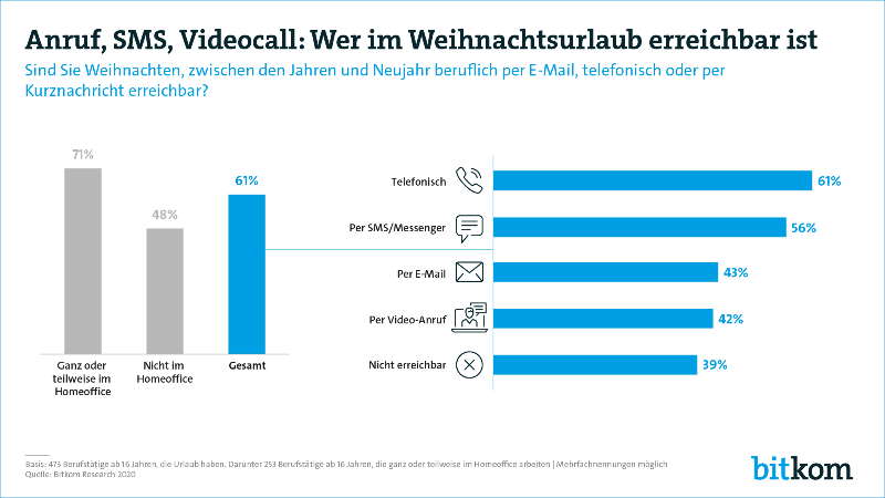 Einen deutlichen Unterschied gibt es zwischen Berufstätigen, die derzeit ganz oder teilweise im Homeoffice arbeiten: Hier sind 71 Prozent dienstlich während des Weihnachtsurlaubs erreichbar – unter Berufstätigen, die nicht im Homeoffice arbeiten, sind es nur 48 Prozent. „Eine Bereitschaft zur Erreichbarkeit außerhalb der Arbeitszeit ist überall dort besonders hoch, wo Arbeitnehmer Vertrauensarbeitszeiten, Flexibilität und flache Hierarchien genießen – und wo es digitalisierte Arbeitsprozesse und -umgebungen gibt. Das ist bei Berufen, die sich für das Homeoffice eignen, eher der Fall als bei Berufen, die eine Präsenz vor Ort erfordern“, sagt Bitkom-Hauptgeschäftsführer Dr. Bernhard Rohleder. „Es ist allerdings grundsätzlich wichtig, dass freie Zeit möglichst ungestört zur Erholung und für Familie und Freunde genutzt werden kann. Unternehmen sollten darauf achten, gut funktionierende Vertretungslösungen zu etablieren.“