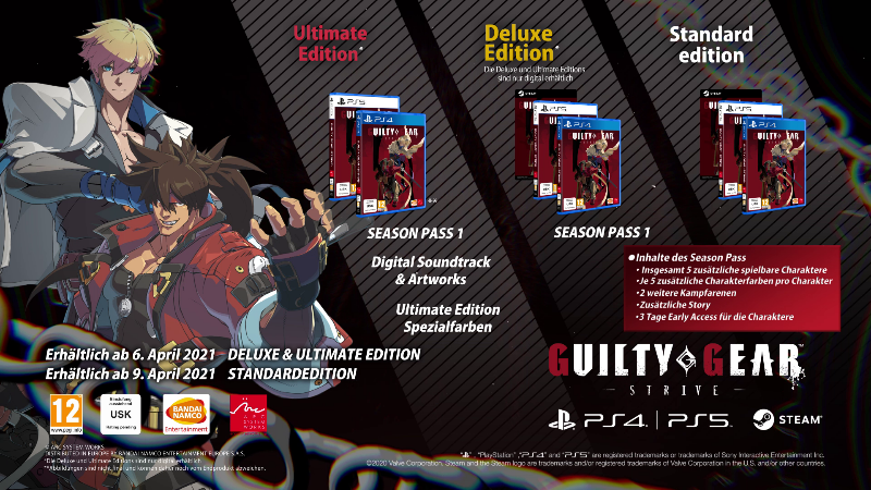 BANDAI NAMCO Entertainment gibt bekannt, dass GUILTY GEAR -STRIVE- ab sofort im PlayStation Store und für PC auf Steam vorbestellt werden kann. Der neueste Teil des Guilty-Gear-Franchises ist ab dem 9. April 2021 digital für Playstation 4, PlayStation 5 und PC erhältlich. SpielerInnen, die die Deluxe oder Ultimative Edition (nur für PS4/PS5 erhältlich) vorbestellen, erhalten drei Tage früher Zugang zum Spiel. Der Release der physischen Standard Edition für PlayStation 4 und 5 erfolgt am 14.04.2021.