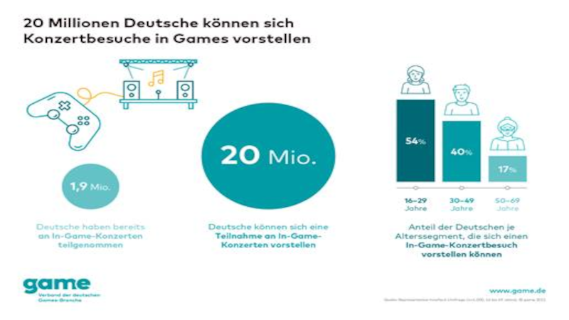 Travis Scott, Lil Nas X oder Marshmello: Viele Künstlerinnen und Künstler haben bereits Konzerte in Computer- und Videospielen gegeben. Einen zusätzlichen Schub haben die Digital-Konzerte während der Corona-Pandemie erlebt: So haben allein die Sänger Travis Scott und Lil Nas X im vergangenen Jahr etwa 80 Millionen Fans in „Fortnite“ und „Roblox“ erreicht. Auch in Deutschland können sich zahlreiche Menschen vorstellen, entsprechende Events zu besuchen. Für rund 20 Millionen Deutsche ist der Besuch von In-Game-Konzerten eine attraktive Alternative, knapp 2 Millionen haben sogar bereits an einem solchen Event teilgenommen. Das gab heute der game – Verband der deutschen Games-Branche auf Basis von Daten des Marktforschungsinstituts Innofact bekannt. Das größte Interesse besteht bei den 16- bis 29-Jährigen: Mehr als jeder Zweite in der Altersgruppe hat Interesse an Konzerten in Computer- und Videospielen; bei den 30- bis 49-Jährigen ist es mehr als ein Drittel. Und selbst bei den 50- bis 69-Jährigen ist ein virtueller Konzertbesuch eine echte Option: Etwa jeder sechste Deutsche in diesem Alter (etwa 17 Prozent) würde sich einen entsprechenden Auftritt anschauen.