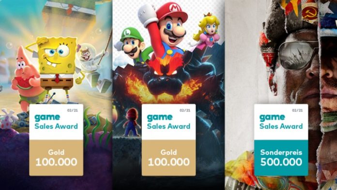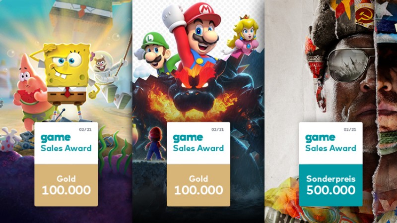 Im Februar kann der game – Verband der deutschen Games-Branche drei Titel mit einem game Sales Award für besondere Verkaufserfolge auszeichnen. So ist es dem First-Person-Shooter „Call of Duty: Black Ops Cold War“ gelungen, die Marke von 500.000 verkauften Spielen zu knacken. Der neueste Teil der Call-of-Duty-Reihe wird hierfür mit einem game Sales Award Sonderpreis ausgezeichnet. Darüber hinaus können sich auch die Jump-’n’-Runs „SpongeBob Schwammkopf: Battle for Bikini Bottom – Rehydrated“ und „Super Mario 3D World + Bowser’s Fury“ freuen: Für über 100.000 verkaufte Spiele gibt es jeweils einen game Sales Award in Gold.