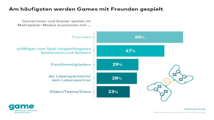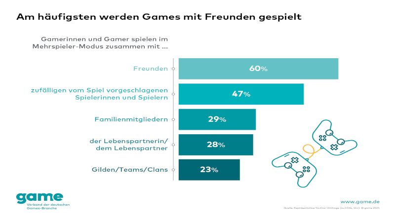 Ob zusammen vor einem Fernseher oder online über riesige Entfernungen: Das gemeinsame Spielen ist elementarer Bestandteil der Games-Kultur. Auch in vielen Beziehungen und Familien hat es einen festen Platz: Mehr als jede oder jeder vierte Spielende von Mehrspieler-Games (28 Prozent) spielt gemeinsam mit dem Lebenspartner oder der Lebenspartnerin. Das entspricht rund 4,6 Millionen Menschen in Deutschland. Das gab heute der game – Verband der deutschen Games-Branche auf Basis einer repräsentativen Umfrage des Meinungsforschungsunternehmens YouGov bekannt. Auch in Familien nehmen Games längst einen festen Platz ein: So spielen rund 4,8 Millionen der Multiplayer-Spielenden in Deutschland gemeinsam mit Familienmitgliedern – das ist knapp jeder Dritte (29 Prozent). Häufiger wird nur mit Freunden (60 Prozent) oder zufällig vom Game zugewiesenen Mitspielenden (47 Prozent) gespielt. In Gilden, festen Teams und Clans spielt knapp ein Viertel der Befragten (23 Prozent).