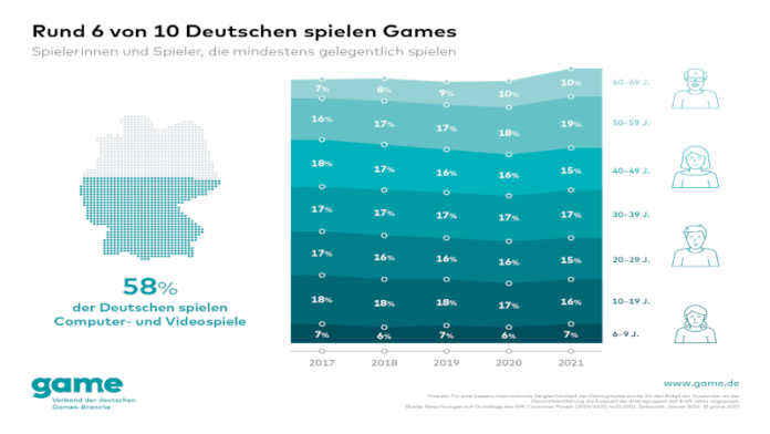 Über die Hälfte der Deutschen spielen Computer- und Videospiele. Insgesamt greifen 58 Prozent im Alter zwischen 6 und 69 Jahren zu Konsole, PC oder Smartphone, um in digitale Welten einzutauchen. Allein im Corona-Jahr 2020 haben dabei rund 5 Prozent mehr Menschen in Deutschland Computer- und Videospiele neu für sich entdeckt. Das gab heute der game – Verband der deutschen Games-Branche auf Basis von Daten der Marktforschungsunternehmen GfK bekannt. Gespielt wird dabei in allen Altersklassen und von allen Geschlechtern gleichermaßen. Die größte Gruppe an Gamerinnen und Gamern ist jedoch die der 50- bis 59-Jährigen. Hier spielt aktuell rund jeder Fünfte Computer- und Videospiele. Zusammen mit den Spielerinnen und Spielern der Altersklasse 60- bis 69-Jahre machen die sogenannten „Silver Gamer“ rund ein Drittel der gesamten Spielerschaft in Deutschland aus. Auch dieser Effekt sorgt für das in den vergangenen Jahren kontinuierlich gestiegene Durchschnittsalter der Spielenden in Deutschland. Aktuell liegt es bei 37,4 Jahren.
