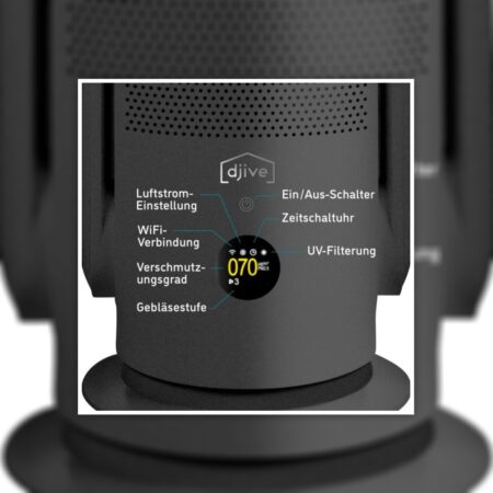 Der djive Flowmate ARC Casual besitzt zwei wichtige Funktionen: die Ventilation und die Luftreinigung. Damit kombiniert er die zwei essentiellen Funktionen für frische, angenehm kühle Luft und ist damit sowohl der perfekte Begleiter für den Sommer als auch für die Grippe- und Pandemiezeit. Das innovative Design des Gerätes sorgt dafür, dass alle Luft, die durch den Ventilator bewegt wird, gleichzeitig gekühlt wieder ausströmt. Dies liegt an der speziellen Art der Luftführung im Inneren des Geräts. Der Luftstrom ist dabei angenehm zu spüren, es entsteht kein unangenehmer Zug wie bei manchen größeren Ventilatoren und darüber hinaus ist er sehr leise: die Lautstärke liegt im Schlafmodus unter 30 Dezibel, sodass auch bei Nacht angenehm gekühlt werden kann. Das innovativste am djive Flowmate ARC Casual ist jedoch seine Luftreinigungsfunktion: ein HEPA14-Filter sowie ein integriertes UV-C-Licht sorgen dafür, dass jegliche einströmende Luft mit einem Reinigungsgrad von 99,995% wieder herauskommt. Das UV-C-Licht kann dabei je nach Bedarf zugeschaltet werden. Partikel, welche durch die Reinigungsfunktion aus der Luft verschwinden, sind unter anderem Allergene, Keime, Aerosole und Feinstaub. Somit nützt das Gerät nicht nur allen, die die Aerosolbelastung mit Viren und Bakterien möglichst klein halten möchten, sondern auch allen Allergikern – das Gerät hilft nämlich zum Beispiel auch bei einer Tier- oder Hausstauballergie. Während der Reinigung misst das Gerät außerdem die Feinstaubbelastung in der Luft, welche leicht die Lunge aller sich im Raum befindenden Personen belasten kann. Die Messwerte werden anschließend mit hoher Genauigkeit auf dem kleinen Display am Gerät angezeigt.