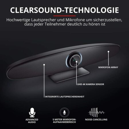 Im Audio-Bereich überzeugt die Trust IRIS Konferenzkamera mit ihrer ClearSound Technologie. Der Lautsprecher ist speziell auf die Wiedergabe von Sprache eingestellt und ermöglicht so glasklar verständliche Stimmen in jeder Konferenz. Schwingungen in den Tönen werden speziell herausgefiltert um Störgeräusche zu vermeiden. Insgesamt funktioniert die Spracheingabe bis zu einem Abstand von fünf Metern zur Kamera. Dabei werden die Stimmen einzelner Teilnehmer mithilfe eines Algorithmus ausgeglichen, sodass jeder Teilnehmer gleich gut zu hören ist, egal, wo genau er sich im Raum befindet. Zusätzlich verfügt die IRIS über Noise Cancelling und unterdrückt damit Umgebungsgeräusche sehr zuverlässig.
