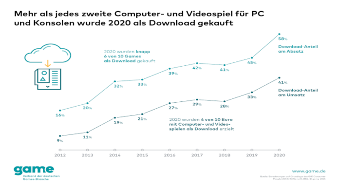 „Der Games-Kauf per Download hat sich in Deutschland im Vergleich zu anderen Ländern langsamer etabliert. Internetanschlüsse mit zu wenig Bandbreite oder zahlreiche Geschäfte mit Games-Abteilungen – von Elektronikmärkten bis hin zu Drogerien – haben viele Spielerinnen und Spieler weiter zu Games auf Datenträgern greifen lassen. Im Corona-Jahr 2020 ist der Anteil der Download-Games nun sprunghaft angestiegen. Hierzu haben nicht zuletzt die Ladenschließungen während der Lockdowns stark beigetragen“, sagt game-Geschäftsführer Felix Falk.
