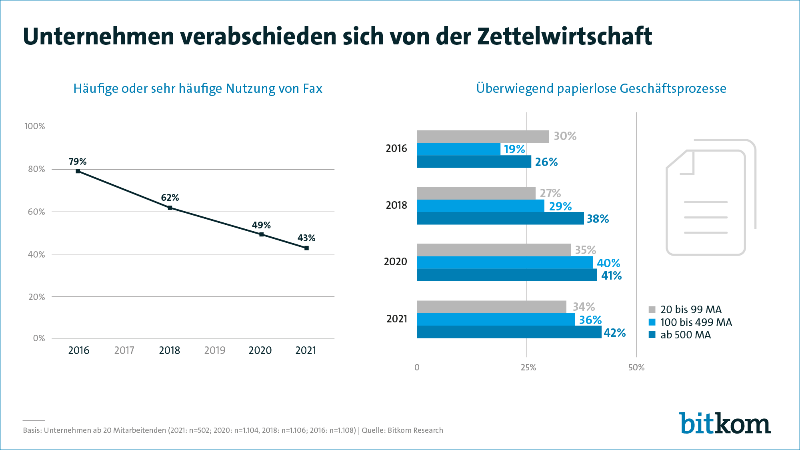 Auch die Büro- und Verwaltungsprozesse insgesamt werden stärker digitalisiert. Britze: „Die Zettelwirtschaft verschwindet langsam, aber sicher aus den Unternehmen.“ So liefen 2016 in jedem dritten Unternehmen (34 Prozent) die meisten Geschäftsprozesse papierbasiert ab, 2021 noch in knapp jedem Vierten (23 Prozent). Umgekehrt wird in einem Drittel der Unternehmen (34 Prozent) überwiegend papierlos gearbeitet, deutlich mehr als noch vor fünf Jahren (2016: 27 Prozent). Vor allem große Unternehmen ab 500 Mitarbeitenden verzichten zunehmend auf Papier. Vier von zehn (42 Prozent) haben den Großteil ihrer Prozesse bereits digitalisiert, 13 Prozent davon vollständig. Etwa genauso viele sind es bei den Unternehmen zwischen 100 und 499 Mitarbeitenden (12 Prozent). Bei kleinen Unternehmen zwischen 20 und 99 Mitarbeiterinnen und Mitarbeitern verzichten nur sechs Prozent gänzlich auf Papier. „Große Unternehmen sind Vorreiter der digitalen Zusammenarbeit“, erklärt der Bitkom-Experte.