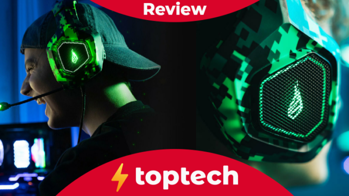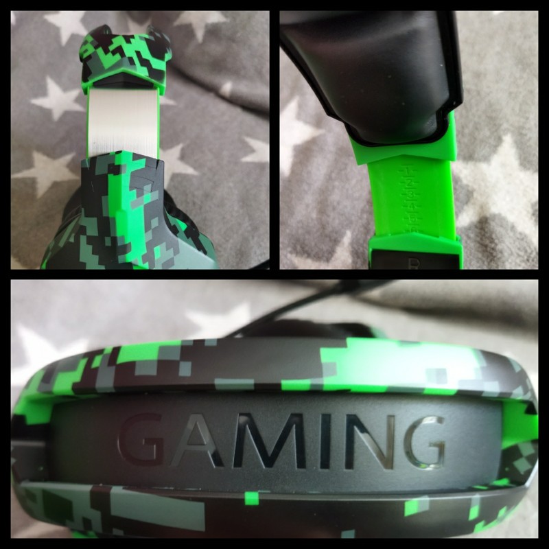Der Bügel führt die Form der Ohrhörer weiter wobei sich die Kontur oben öffnet in dem eine Fläche mit dem Schriftzug „Gaming“ eingesetzt ist. Für eine Längenverstellung ist der Bügel oberhalb der Ohrhörer auf beiden Seiten geteilt, für eine bessere Verstellbarkeit ist auf der Innenseite eine gut lesbare Skala eingebracht.