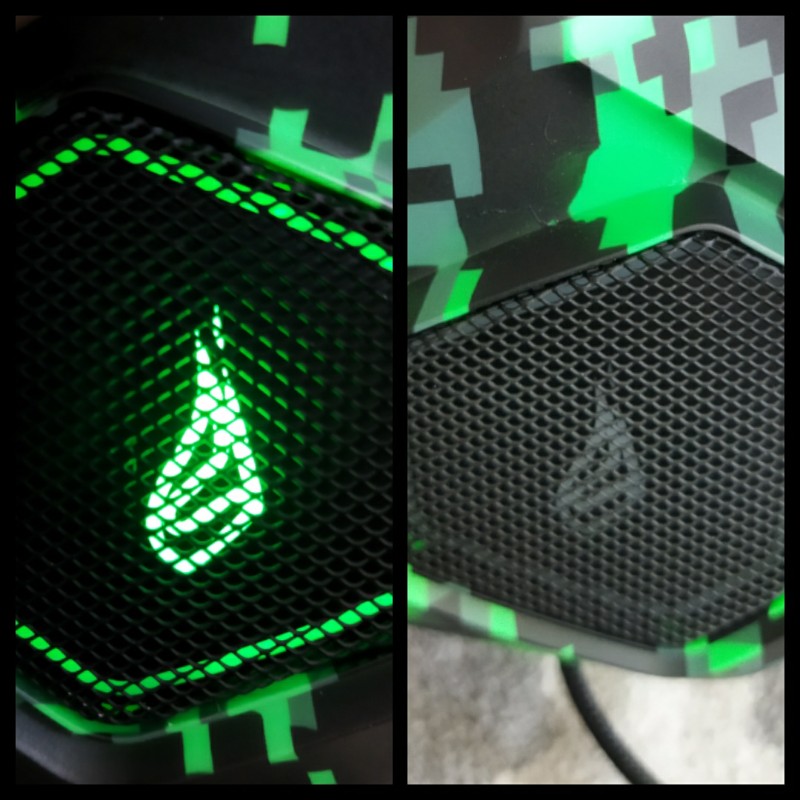 Das SureFire SKIRMISH hat ein schönes optische Feature welches bei vielen analogen Headsets oft ausgelassen wird, eine Beleuchtung. Bei vielen Headsets die über Klinke angeklemmt werden gibt es häufig keine Beleuchtung wie sie bei USB Headsets längst schon fast standardmäßig mit drin ist. Zwar wird auch hier ein zusätzlicher Anschluss über USB benötigt um Strom für die LED und Headset zu bekommen, aber dennoch gibt es diese Option. Beim Einsatz am PC sollte das keinen Umstand sein einen Anschluss zu erreichen, bei Konsolen sieht das aber leider etwas anders aus. Wer hier das Headset an seinen Controller anschließend, hat in der Regel keinen Anschluss in Reichweite um über das etwa 10 cm lange Kabel einen USB-Anschluss erreichen zu können. Not macht erfinderisch und um es trdm austesten zu können habe ich mit einem USB-Verlängerungskabel und USB Netzstecker Licht ins Dunkel gebracht. Dabei leuchten nicht nur die Seiten der Ohrhörer, sondern auch die Front des Mikrofon. Bei der Farbe hat man allerdings keine Auswahl und beschränkt sich auf die dominierende Farbe des SKIRMISH… grün. Wer sich dachte, dass das Headset so schön schick ist, bekommt mit den LED noch ein wenig mehr das Funkeln in den Augen. Die LEDs verleihen dem Headset noch mal das gewisse Etwas mit der Einschränkung, dass nur PC Nutzer wirklich davon profitieren.