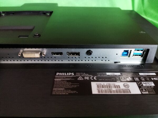 Mit Anschlüssen ist der Philips 275B1H gut ausgestattet. Auf der Rückseite sind nach unten gerichtet die Anschlüsse für HDMI (1.4), Display Port und DVI. Zusätzlich verfügt der Monitor über USB-Anschlüsse für Daten und einen weiteren als Stromanschluss für zum Beispiel Smartphones als Schnellladeanschluss. Um die USB-Ports nutzen zu können wird der Monitor über das mitgelieferte USB-Verbindungskabel mit dem PC oder Konsole verbunden. Ebenfalls benötigt ihr die USB Verbindung um die integrierte Kamera zu nutzen. Ein 3,5 mm Klinkenanschluss lässt euch dazu noch externe Lautsprecher oder Kopfhörer anschließen.