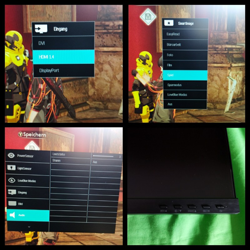 Wenn wir schon das Menü erwähnt haben, bleiben wir auch mal direkt hier… Das Menü wird über die Tasten am unteren rechten Bildschirmrand gesteuert. Sprache, Display Einstellungen wie Helligkeit, Kontrast oder Funktionen des Lichtsensor und Lautstärke der Integrierten Lautsprecher. Ohne das Menü zu aktivieren sind die Tasten mit direkten Funktionen hinterlegt um sich unter anderem durch die Eingangssignale zu navigieren.