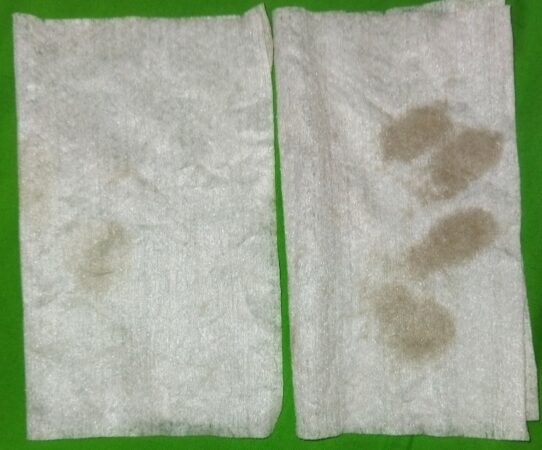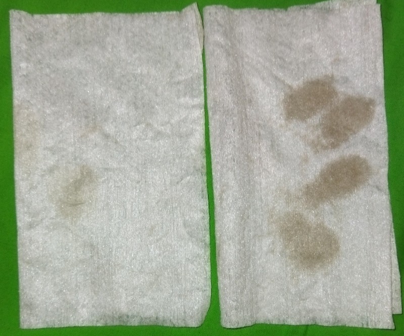Als kleiner Vergleich habe ich mit jeweils einem Tuch eine verschmutzen Fliese mit einer bereits gereinigten abgewischt.