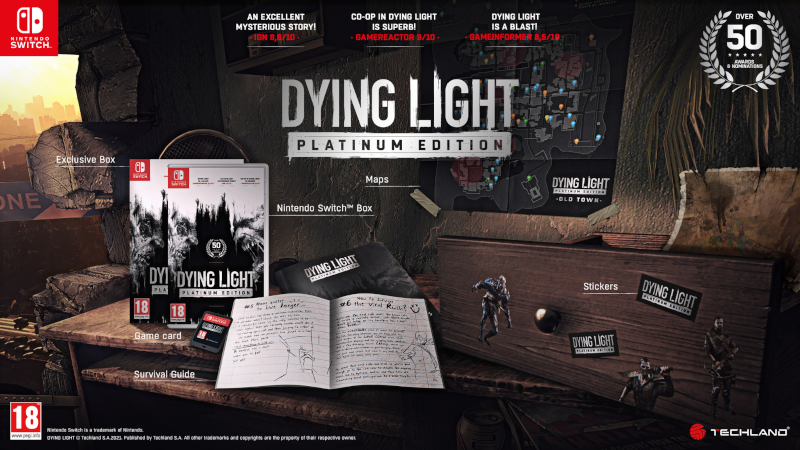 Ein einziger Durchlauf der Dying Light Platinum Edition bietet den Fans über 100 Stunden Einzelspieler-Gameplay und unzählige zusätzliche Abenteuer, wenn sie mit Freunden spielen und die Welt im Koop-Modus erkunden. Die physische Veröffentlichung der Platinum Edition für Nintendo Switch wird zudem folgendes enthalten: